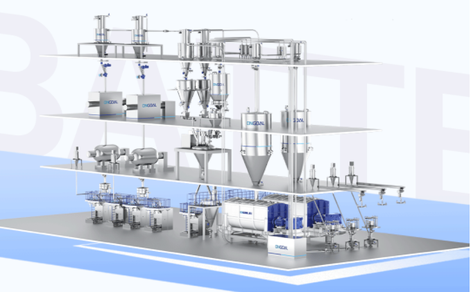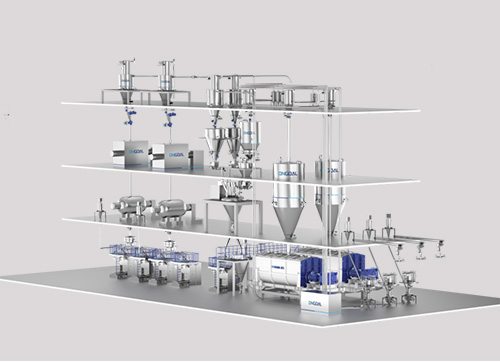 我們從解包投料、儲(chǔ)存破拱、氣力輸送、計(jì)量配料到混合攪拌的整個(gè)工藝流程,全方位多角度考慮生產(chǎn)的潔凈、便利與安全,為客戶(hù)提供一整套食品級(jí)原料處理一站式解決方案。
