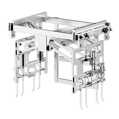 夾持清料機構(gòu),精確控制夾持位置,利用料鉤裝置固定噸袋,防止噸袋滑脫,實現(xiàn)噸袋穩(wěn)定舉升、移動,氣缸推動拍袋組件,在下料過程中進行拍袋,有效保障清空率。