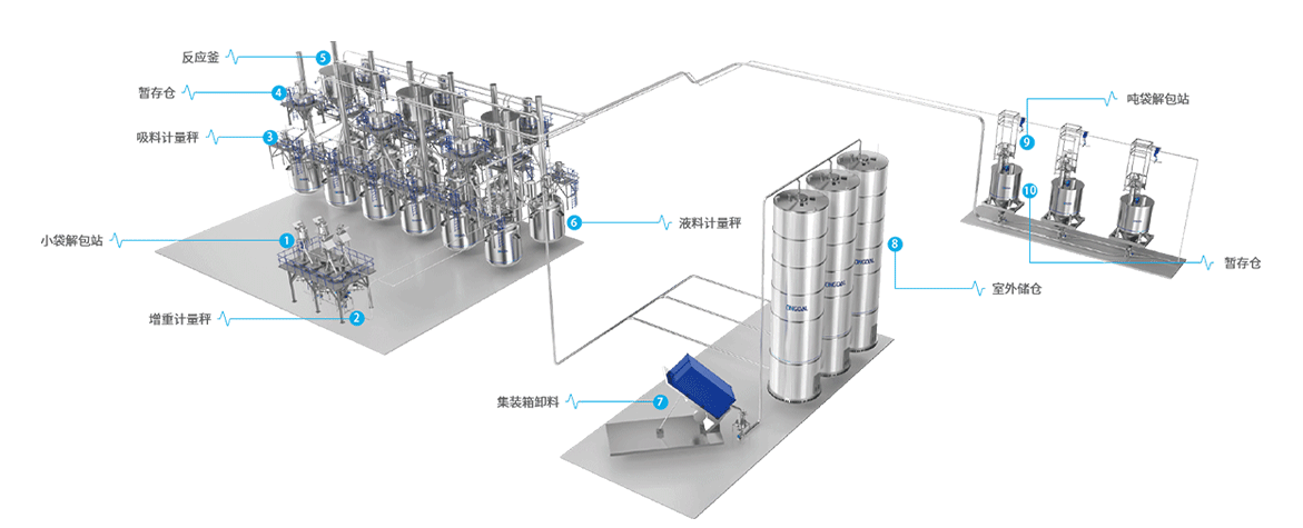 常用于聚酯、聚氨酯等有機(jī)物合成的全自動(dòng)供料系統(tǒng),實(shí)現(xiàn)從大料,中料到小料的全自動(dòng)化配料計(jì)量,全程氮?dú)庋h(huán)輸送設(shè)計(jì)。