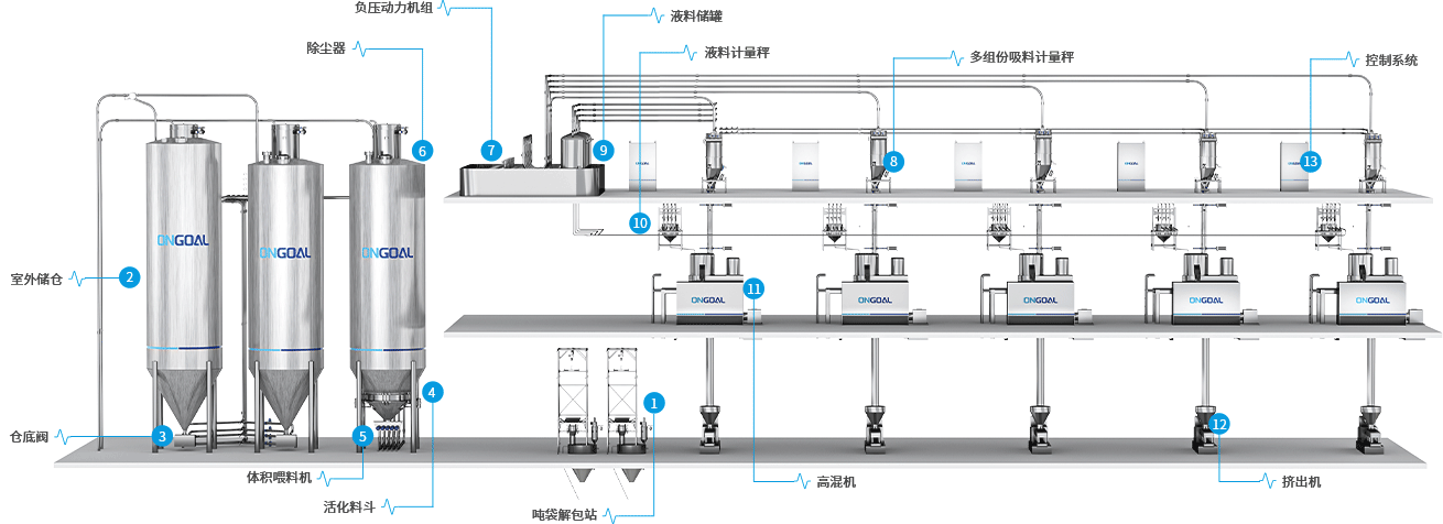 常用于PVC線纜造粒產(chǎn)線,用于處理粉料和油料的自動配料。系統(tǒng)由解包系統(tǒng)、粉料儲存系統(tǒng)、油料儲存系統(tǒng)、氣力輸送系統(tǒng)、計量系統(tǒng)和控制系統(tǒng)組成。
