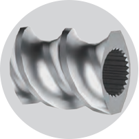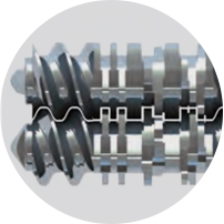 采用同向捏合型雙螺桿,物料受到輥壓及反向速度梯度作用,形成8字型通道輸送,螺桿浮起,避免螺桿與機(jī)筒摩擦,使物料均勻混合分 散;共軛型螺桿,具備良好的自潔性。